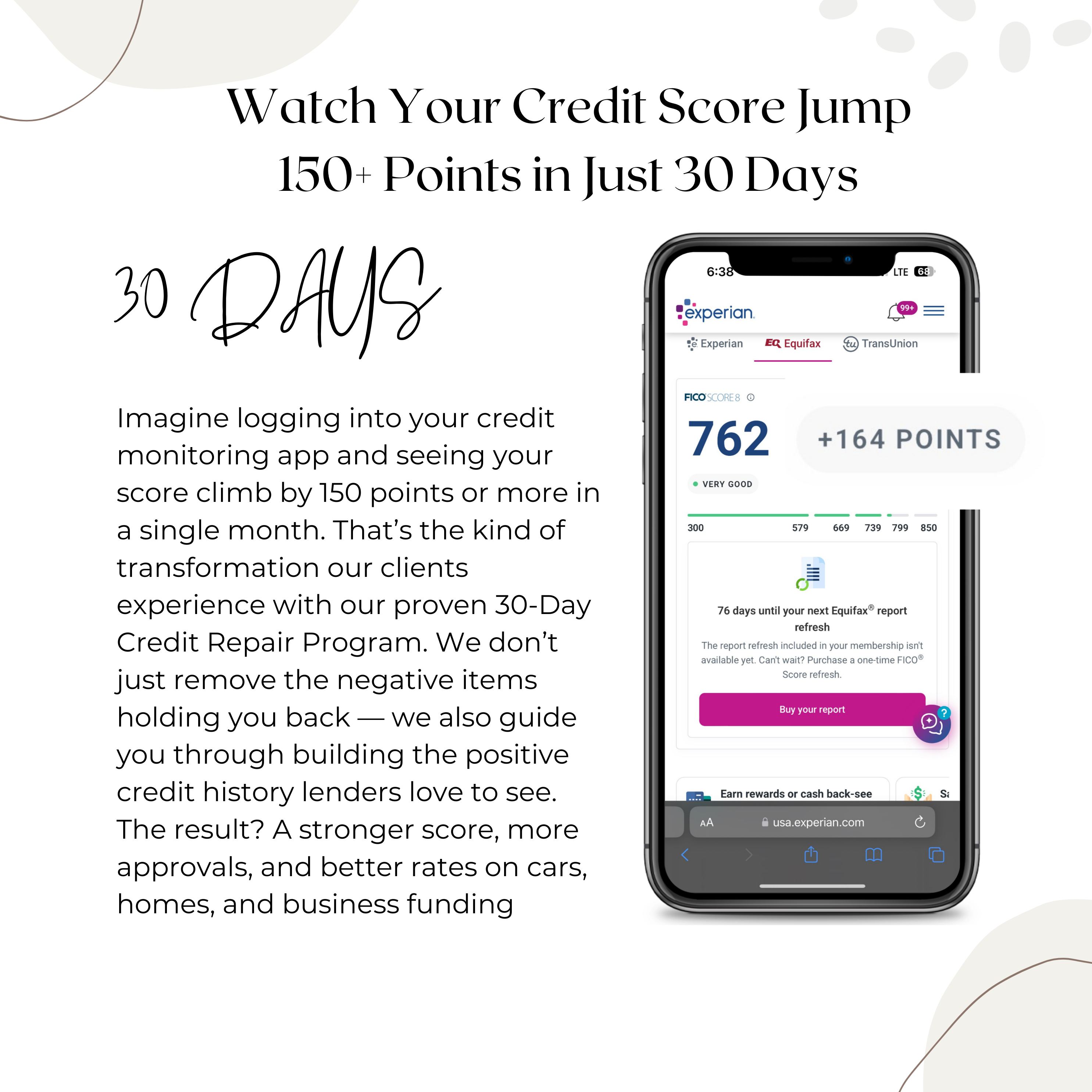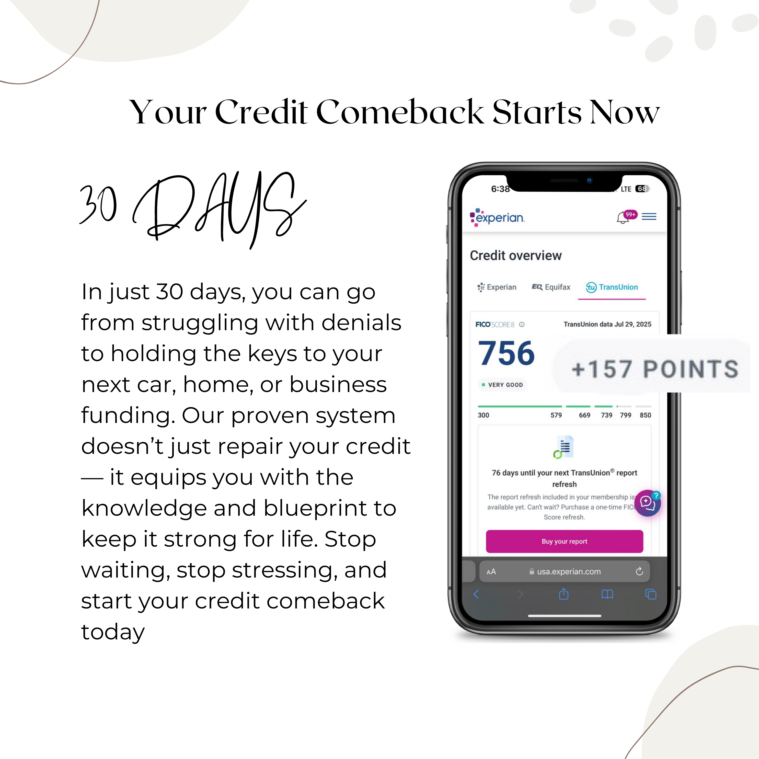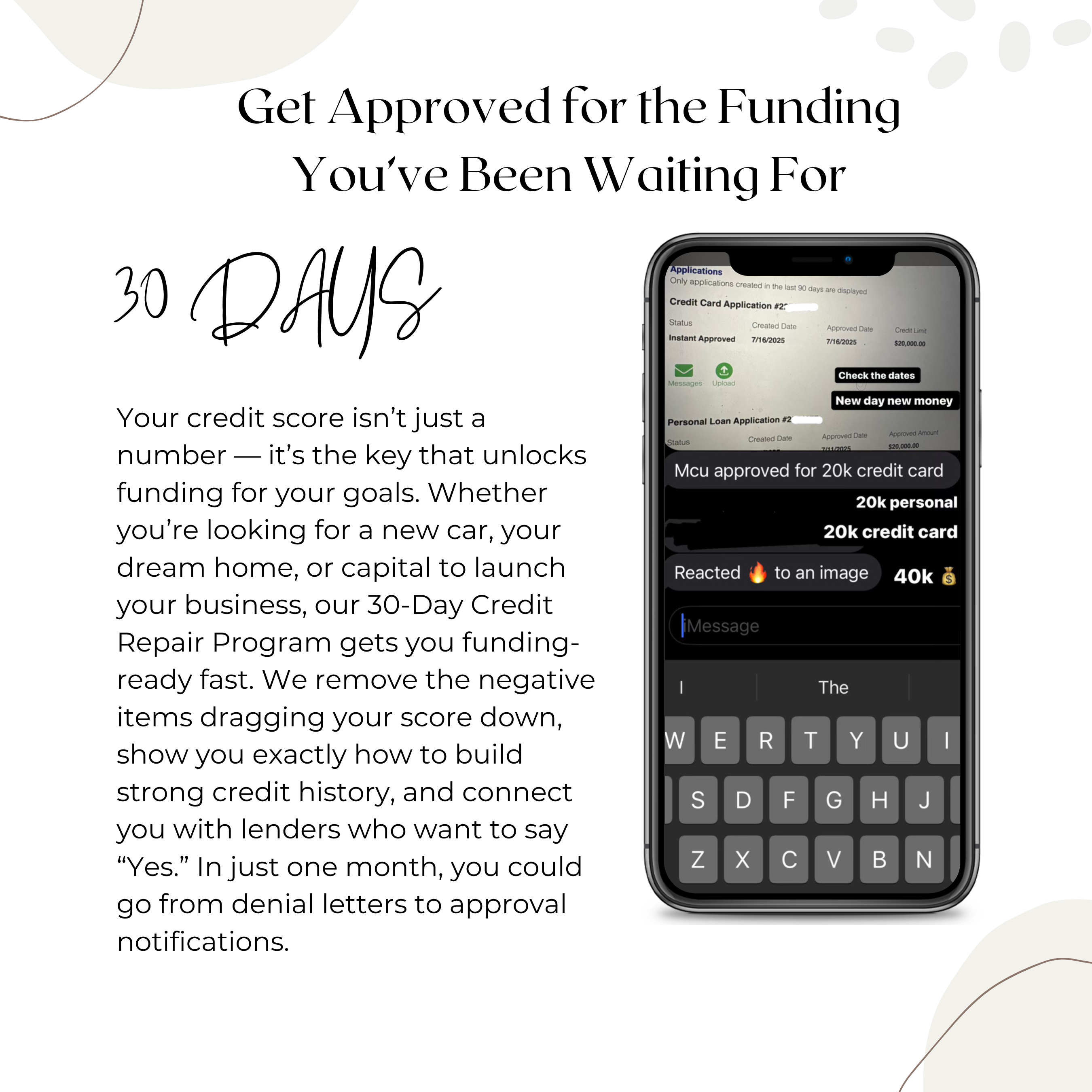 Our 30-Day Credit Repair Program doesn’t just clean up your credit fast — it gives you the exact blueprint to build and maintain the kind of credit that gets you approved for cars, credit cards, and business funding.